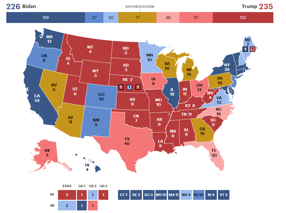 全米50州と首都ワシントン・コロンビア特別区のうち、40以上は既に結果が見えている。分かっている。民主、共和両党のイメージカラーから、民主党優勢州は「ブルーステイト(Blue State、青い州)、共和党優勢州は「レッドステイト(Red State、赤い州)」」と呼ばれている。40以上の州とワシントンDCはきれいに色分けされている。そして、残りの約10州は激戦州(Battleground State)とか、「パープルステイト(紫の州)」などと呼ばれる。大統領選挙の結果を決めるのはこれらの激戦州だ。今回の選挙では、激戦州(Toss-up)は、以下の地図にあるおうど色の州だ。赤と青はそれぞれ、共和党のトランプと民主党のハリスが「固めた」州と言えるだろう。基礎票はトランプ235対ハリス226となる。ここからスタートとなる。