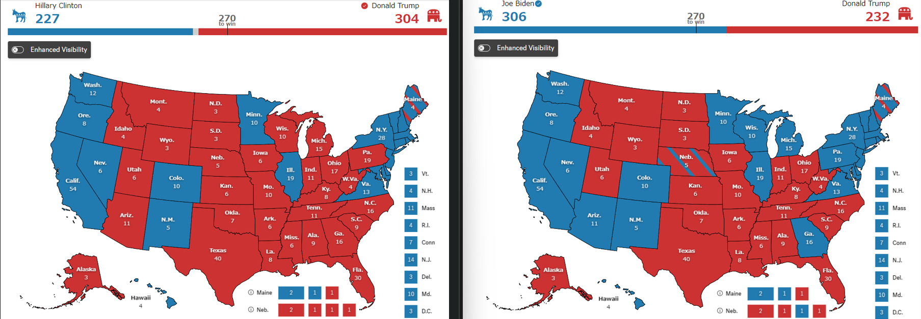 ハリス陣営としては、この2つの州を明け渡す訳には行かない。何とかどちらか1つの州を取りたいところだ。ネヴァダ州は2016年も、2020年も民主党が取っているので、ここは激戦州だが大丈夫という計算をしているだろう。アリゾナ州選出のマーク・ケリー連邦上院議員を副大統領候補にすれば、アリゾナ州も民主党が取れる可能性が高まる。しかし、そうなると、大統領候補のハリスがカリフォルニア州出身、副大統領候補のケリーがアリゾナ州出身となって、ロッキー山脈より西の西部に偏り、五大湖周辺州や南部にはなじみがない顔ぶれとなってしまう。やはり重要なのは、五大湖周辺州、ペンシルヴァニア州だ。そして、アフリカ系アメリカ人有権者の多いジョージア州だ。ジョー・バイデンはアフリカ系アメリカ人の政治家やコミュニティリーダーと長年にわたり、深い関係を築いていた。ハリスは、父親がジャマイカからのアフリカ系アメリカ人移民ということで何とかアピールしたいところだ。