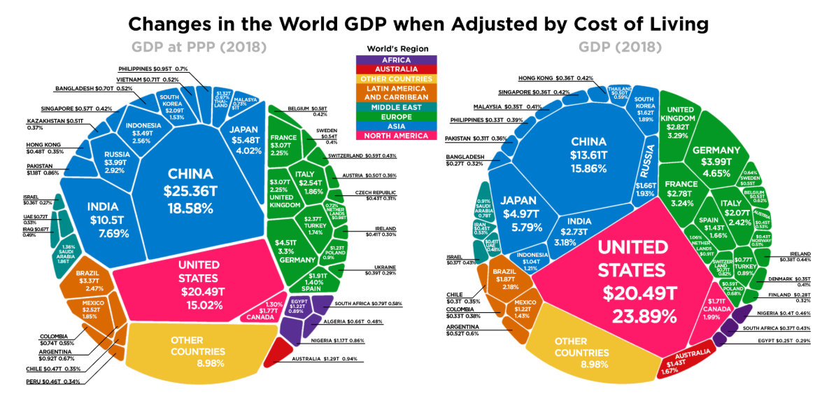 先月、私たちは現在のアメリカ・ドル表示の各国のGDPをイラストと示す可視化したものを発表した。このGDPは生活にかかるコストを入れていない。また、それぞれの国家の生産高を比較するために市場における為替レート使用している。世界の名目GDP(右側)と購買力平価GDP(左側)のいくつかの違いに気づくだろう。明らかなことは、アメリカは世界の名目GDPで最大のシェアを占めているが、中国は購買力平価GDPで最大のシェアを占めている。