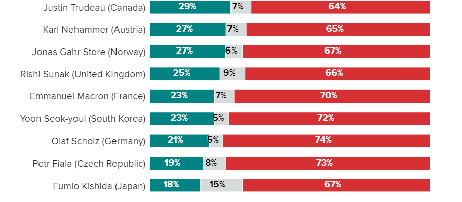 西側先進諸国の政治家たちの支持率が軒並み20%台、30%台であり、40%もあれば立派なものという状況になっている。不支持率は50%、60%を超えており、単純に言えば、有権者の過半数が支持していないということになる。これに対して、アジア諸国の、民主的な選挙で選ばれた国々の指導者たちの支持率は高いということを西側のメディアも注目している。