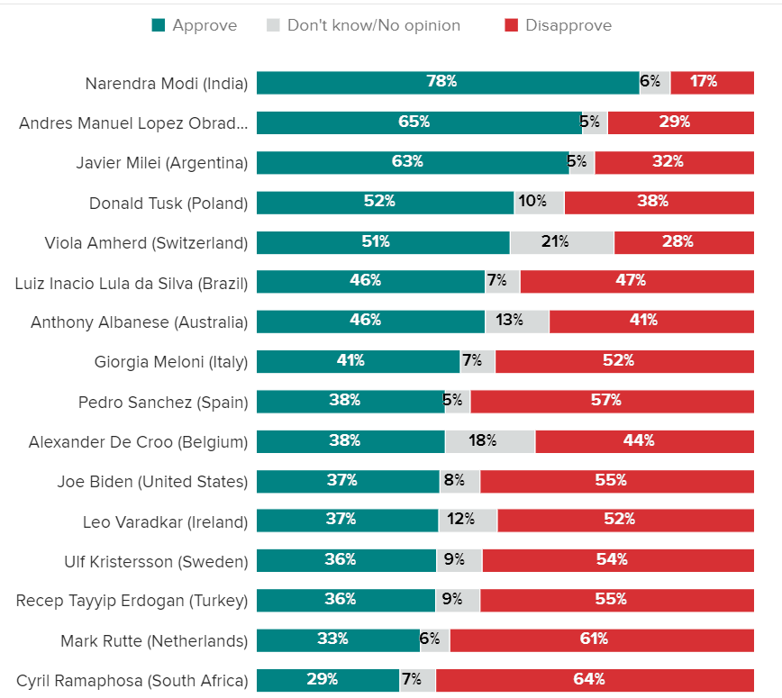 対照的にインドネシアでは、80%の支持率を記録して、任期を終えたジョコ・ウィドド大統領(通称ジョコウィ)の後任として、プラヴウォが大統領に就任する。フィリピンでは、フェルディナンド・マルコス・ジュニア大統領が、前任のロドリゴ・ドゥテルテ大統領と同様に好感を持たれている。そして、4月に始まるインドの選挙では、ナレンドラ・モディ首相が3回連続の圧勝を収めることがほぼ確実視されている。