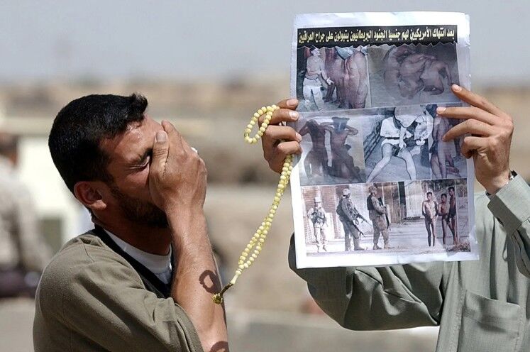 2004年5月8日、アブグレイブ刑務所でアメリカ当局に拘束されているイラク人囚人の親族が収容所内でアメリカ兵がイラク人囚人を虐待している写真を見て反応を示している
