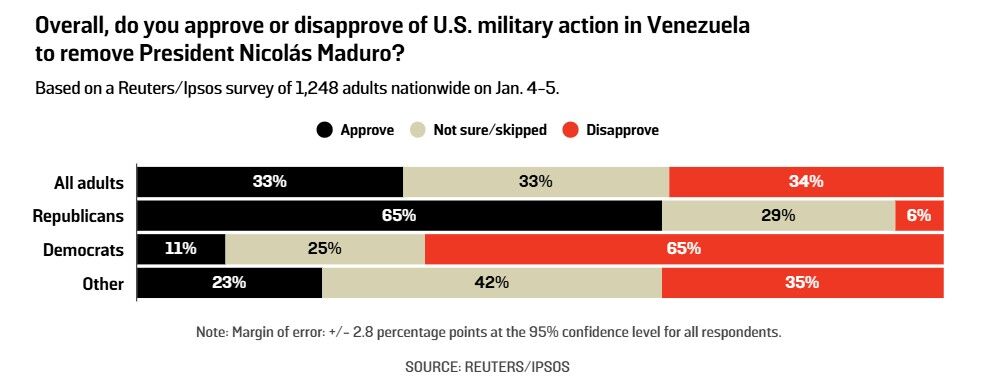 しかし、ロイター社とイプソス社が月曜日に発表した最新の世論調査結果によると、今週末の展開に対するアメリカ国民の支持と不支持は、より均衡して分かれている。この世論調査は1月4日と5日に実施され、全国の成人1200人以上を対象に行われた。世界の注目を集めるようになった物議を醸す軍事作戦をアメリカ国民がどう見ているか、興味深い一面を示している。