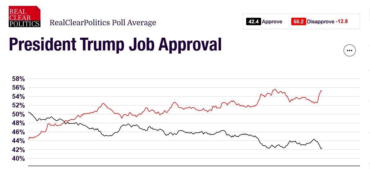 政権発足以来のトランプ政権の支持率の推移(赤線が不支持率)