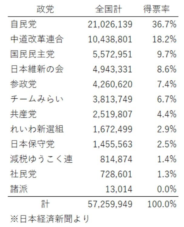 今回の選挙での敗北者は立憲民主党であった。他の二桁議席を獲得している政党は、公明党を含めて議席を伸ばしている。立憲民主党は旧民主党時代から執行部に入っていたような大物議員たちが軒並み小選挙区で落選し、比例代表でも復活できなかった。立憲出身の比例代表復活者たちの多くは自民党の候補者が全員当選した上に議席が余る形で配分された人たちである。立憲民主党が消滅し、他の政党で議席を分け合ったという形になる。
