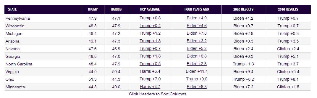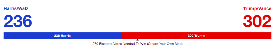 五大湖周辺州のウィスコンシン州、ミシガン州、ペンシルヴァニア州での支持率の数字は接戦となっているが、8月と9月にハリスに遭った勢いは落ちている。トランプが追い上げて逆転している。民主党のジョー・バイデン政権がハリスの援護射撃のために、オクトーバーサプライズを仕掛けることが考えられるが、経済政策では投開票日までに効果が出る施策は難しい。また、ウクライナ戦争や中東紛争で停戦ということも考えにくい。このままの状況で進むとなると、トランプが勝利を収めるということになりそうだ。また、現状から逆転してハリスが勝利ということになれば、選挙後に不満を持った有権者たちが暴力に訴えるということも起きる可能性がある。目を離せない展開となるだろう。
