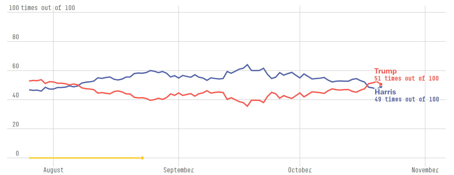 「FIveThirtyEight」での予測(赤:トランプ、青:ハリス)